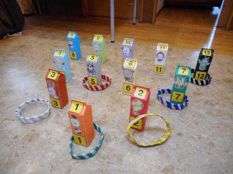 1階は利用者さん9人おられますが、去年の暮、2階利用者さんがなくなり5人しかおられませんので職員が応援。輪投げをもう少し大きくすればよかったのですが、少し小さすぎ、なかなか上手く入りません。線引きをして「ここから投げて」とお願いしても、利用者さんどんどん前に行き、牛乳パックすれすれまで進み、真っ下のパック目掛けて投げます。最終的には1階の勝利です。