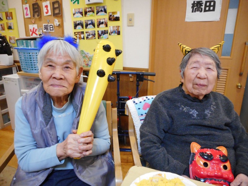 2月3日は節分、お昼はバラ寿司をいただき、3時のおやつを挟んで利用者さんに、鬼の金棒・お面・頭には鬼の角をつけて頂き、「はい・ポーズ」楽しい写真を撮ることができました。