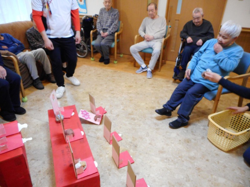 ひな壇を作りその上にお雛様をうつぶせに置き、利用者さんには10個のおじゃみを、まるい的を目掛け投げていき、うつ伏せのお雛様を立ち上がらせお雛様を並べるのですが、なかなかむつかしく、職員も苦戦しています。
