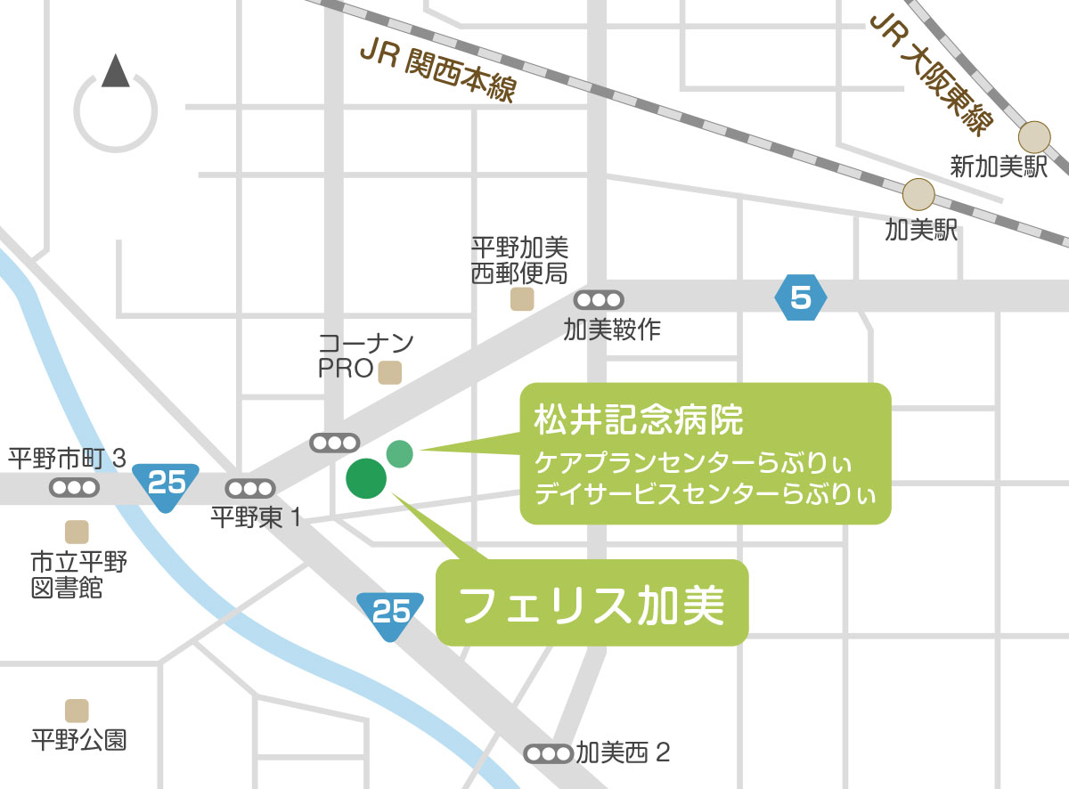 JR大和路線「加美駅」またはJRおおさか東線「新加美駅」より