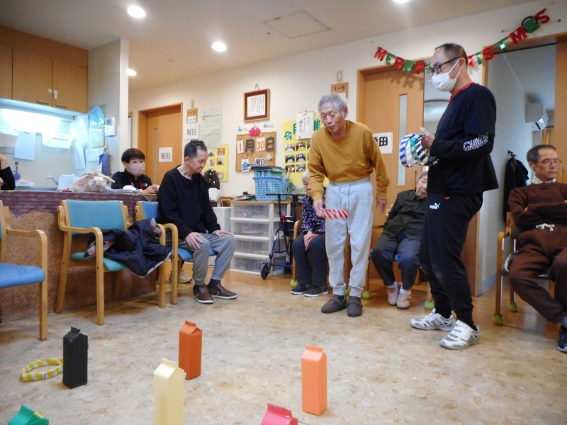 1階は利用者さん9人おられますが、去年の暮、2階利用者さんがなくなり5人しかおられませんので職員が応援。輪投げをもう少し大きくすればよかったのですが、少し小さすぎ、なかなか上手く入りません。線引きをして「ここから投げて」とお願いしても、利用者さんどんどん前に行き、牛乳パックすれすれまで進み、真っ下のパック目掛けて投げます。最終的には1階の勝利です。